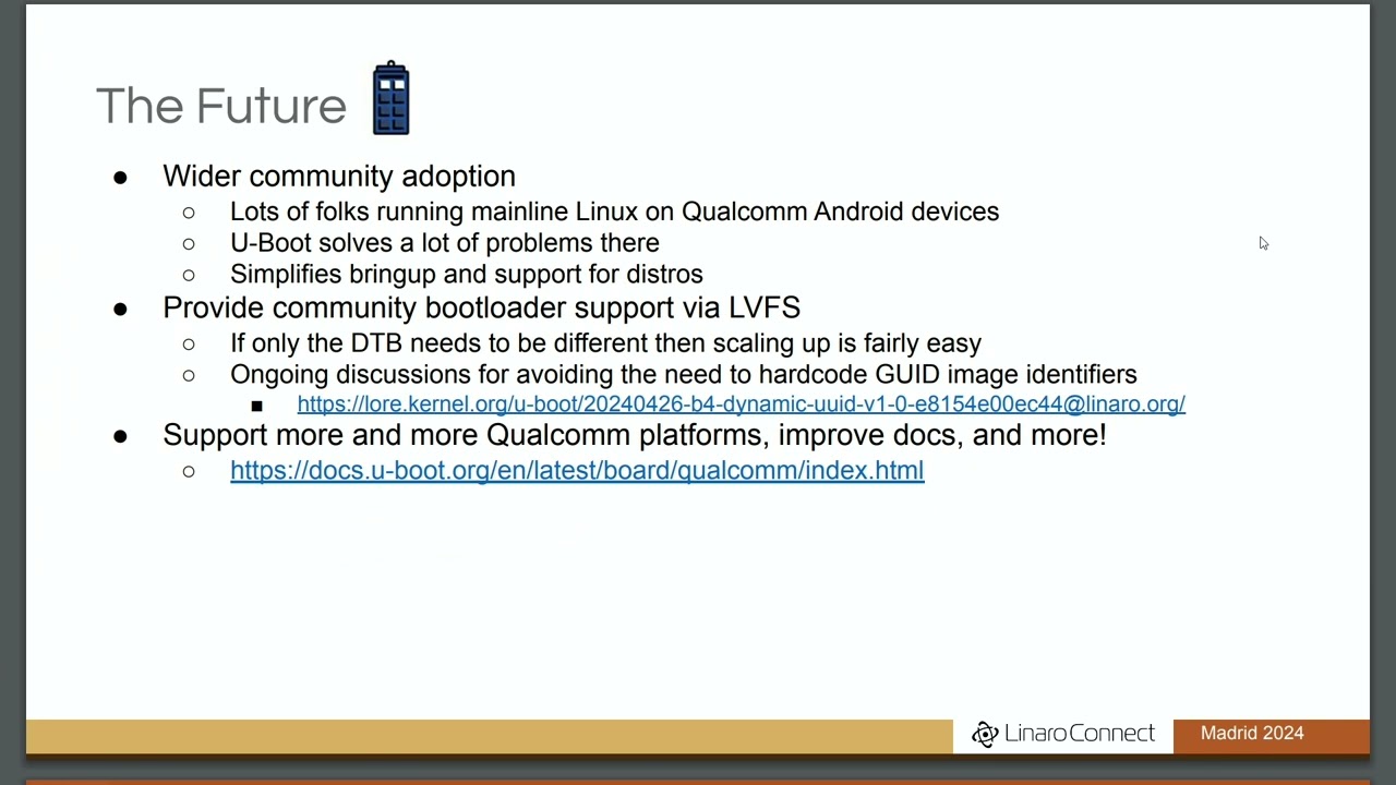 Caleb Connolly from Linaro shared the story how Qualcomm support in U-Boot improved from terrible to good. He mentioned several quirks and issues encountered along the way.